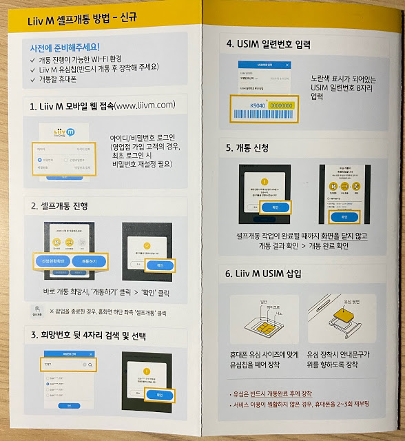 유심을 받으면 다시 홈페이지에 접속해서 셀프개통을 진행한다. Liiv M 서비스를 처음 개통할 때와 같은 방법으로 진행한다. 데이터 쉐어링을 위한 전화번호를 추가로 하나 정하는데 자신의 휴대전화번호 뒤 4자리와 같게 하고 검색해서 적당한 것을 정하면 된다.(번호를 기억하지 않아도 크게 문제가 되지는 않는다. 개통후 태블릿에서 번호를 확인할 수도 있다.)