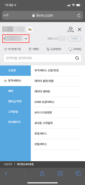 이제 Liiv M 홈페이지에 로그인하면 캡처화면과 같이 번호를 선택할 수 있는 부분이 있다.