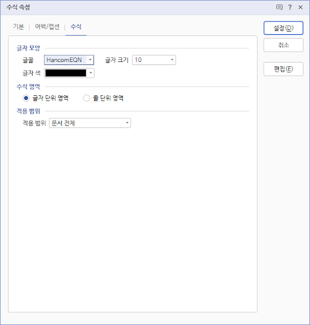 3. 글꼴은 HancomEQN 혹은 HYhwpEQ을 선택하고, 적용 범위를 '문서 전체'로 설정